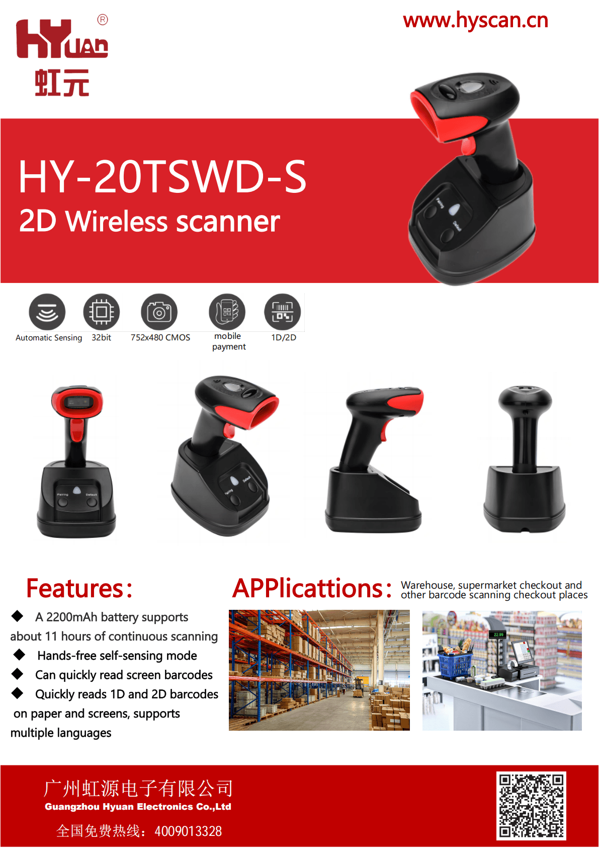 A 2200mAh battery supportsabout 11 hours of continuous scanning